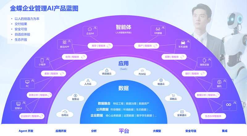 基于金蝶的企业管理AI产品蓝图,未来金蝶的AI产品也将遵循“以人的创造力为本”、“交付结果”、“安全可信”、“自适应体验”、“生态开放”的五大产品理念,持续场景化创新。